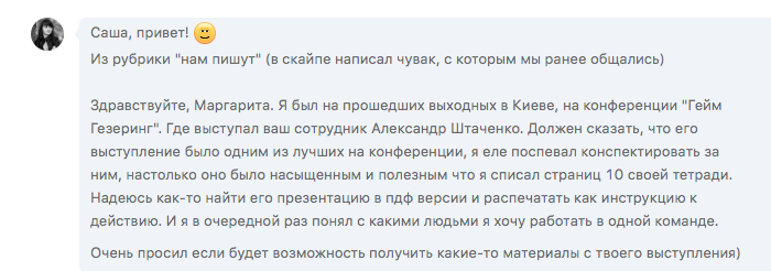 Приятно, что доклад поможет коллегам лучше готовится к будущим проектам, экономить ресурсы. И вдвойне приятно получать вот такой фидбэк.