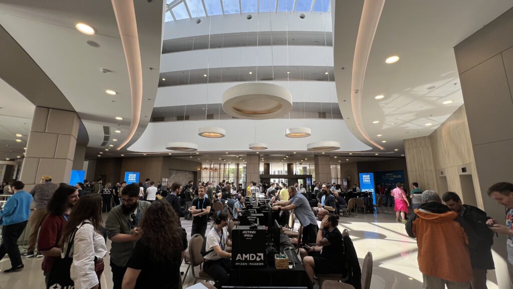 На конфе вы найдете 7 лекционных залов разных размеров, один из которых у бассейна. Большая зона с шоукейсами, где компы расставлены так, что садясь за один из них ты как будто бы проваливаешься в атмосферу компьютерного клуба из детства, где вокруг тебя единомышленники и геймеры. Класс, я кайфонул. Зона со стендами от партнеров и спонсоров – кстати, показалась мне пустоватой и скучной, видимо этот медиум уходит в прошлое. Если раньше в таких местах и был стартовый нетворк, то тут он находится на террасе, где свежий воздух и весь движ. А еще на ребуте классно кормят, еды хватает даже тем, кто пришел покушать в конце паузы на ланч.