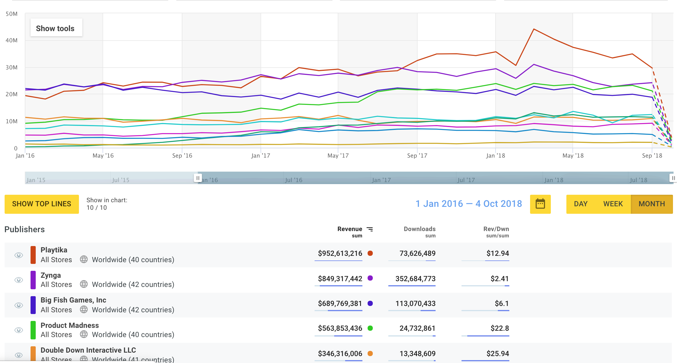 За ответами я пошел к DataMagic. На графике ниже доходы топ 10 слотовых операторов в период, аналогичный в репорте DeltaDNA. Продукты 10 компаний входят в топ гроссинг жанра (США) и генерят более 85% всего объема денег на рынке.