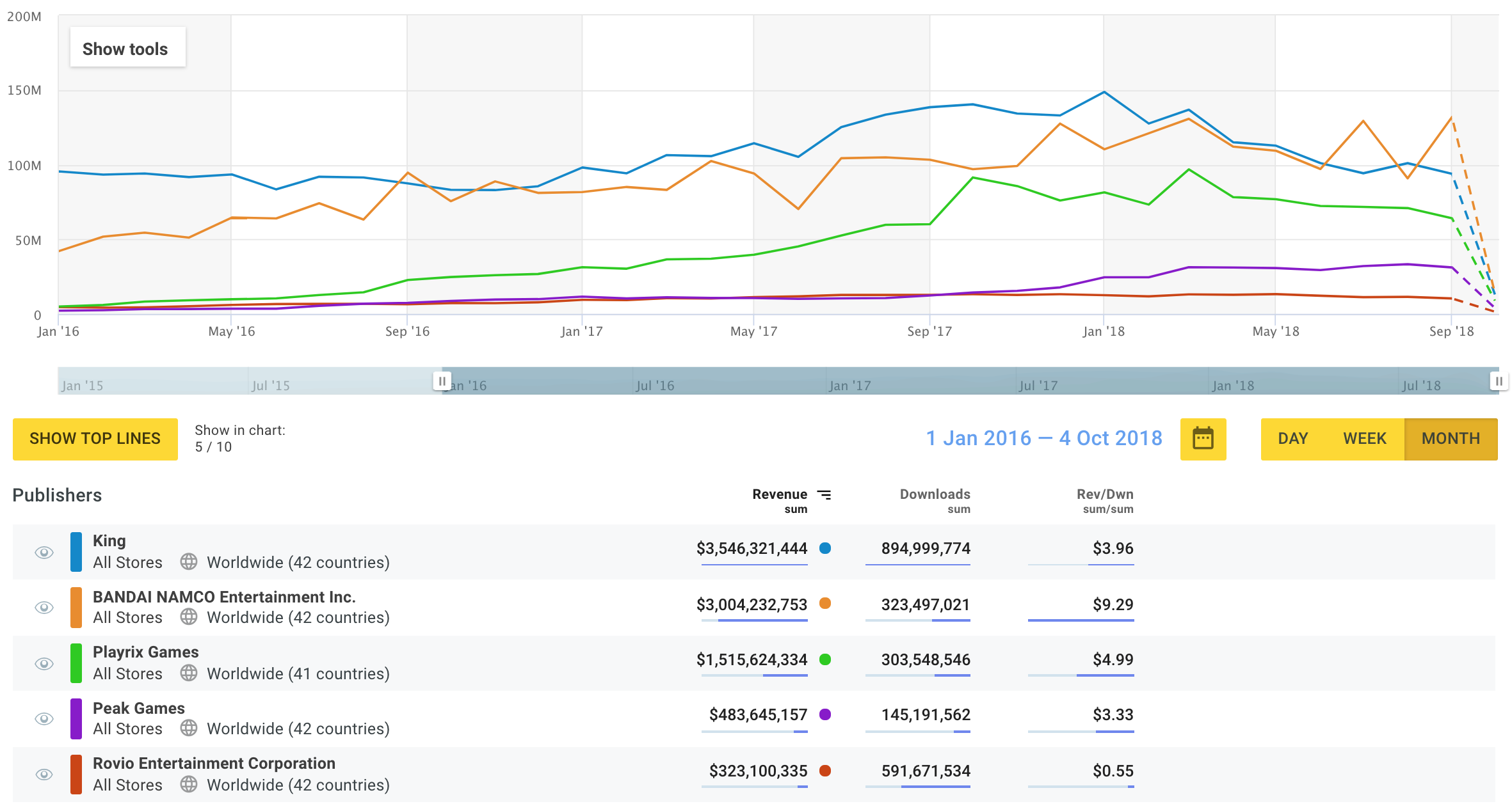 Эти демонстрируют стабильный рост на протяжении последних лет. И это не потому, что люди стали больше тратить в стратегиях, а потому что стали меньше играть, тем самым уменьшили знаменатель. Синим на графике сверху – Supercell, чьи суммарные доходы снижаются из года в год. Остальные игроки на рынке растут, но все равно имеют в 2 раза меньше ревеня.