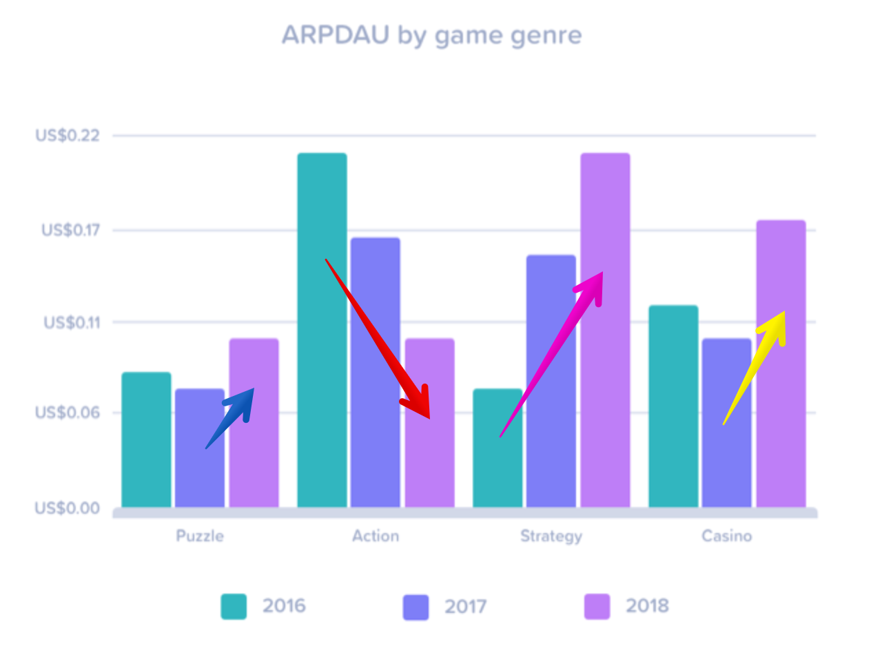 Тут у всех все хорошо, однако в жанр приходит все больше людей. Из-за постоянного роста DAU, рост KPI в репорте у Дельты не так заметно.