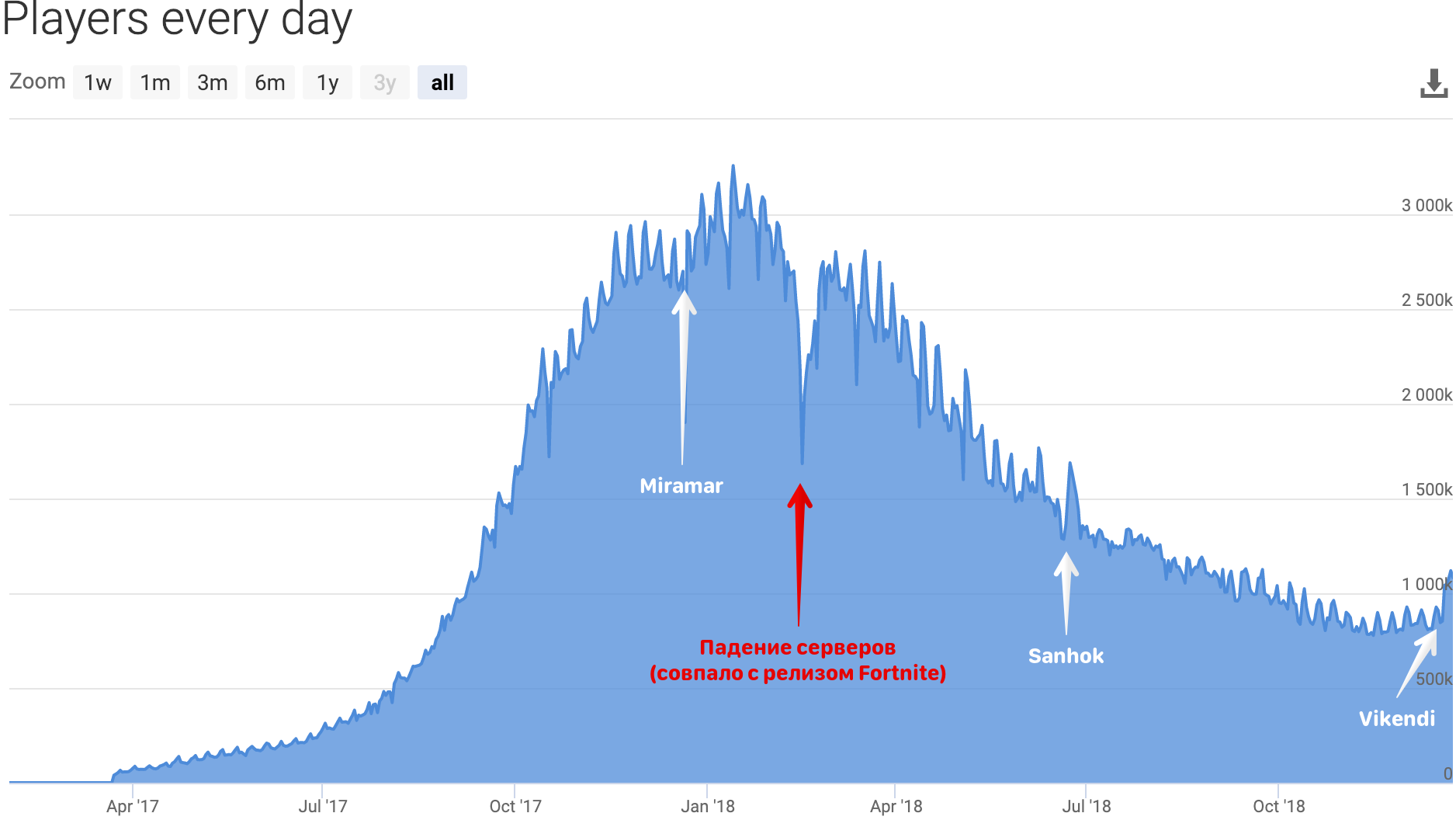- После релиза карты Мирамар, игра снова пошла вверх. Рост продлился 1 месяц, затем снова начался спад.