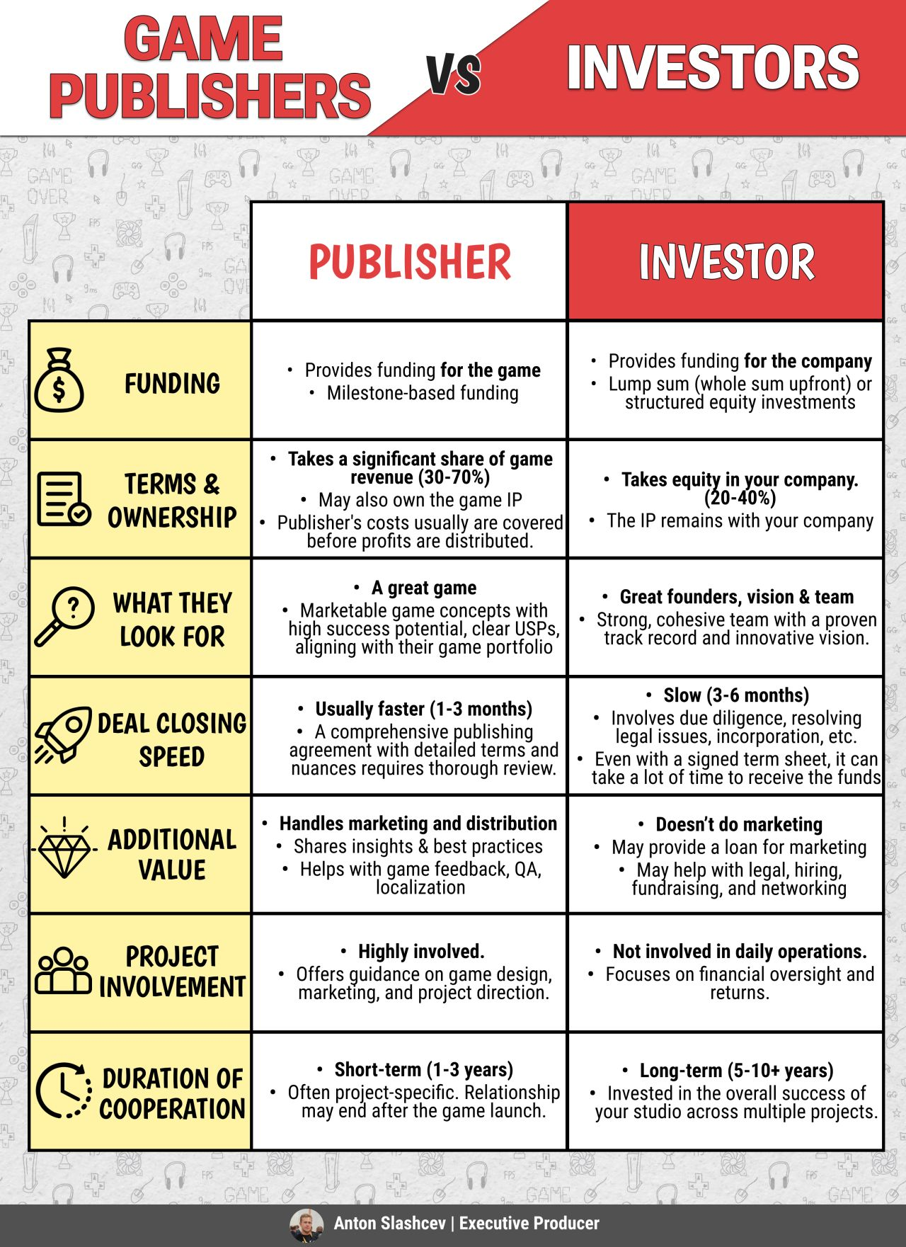 Когда речь заходит о финансировании разработки игры, перед стартапом встает выбор: работать с игровым издателем или привлечь инвесторов. Оба варианта имеют свои особенности, как в плане предоставления средств, так и в вопросах контроля над проектом и перспектив сотрудничества. Давайте разберемся, чем именно отличаются эти два подхода.