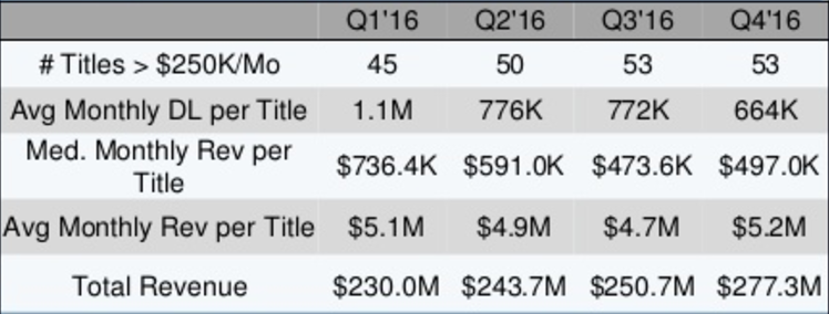 В 2016 году больше вышло, а соответственно и больше заработало игр по известным и раскрученным IP (Disney, etc). С приростом игроков порядка 150 тыс в месяц, можно расчитывать на $500 тыс долл в месяц NET Revenue.